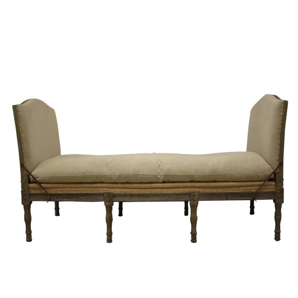 French daybed/window bench with flax linen upholstery and pickled wood frame.