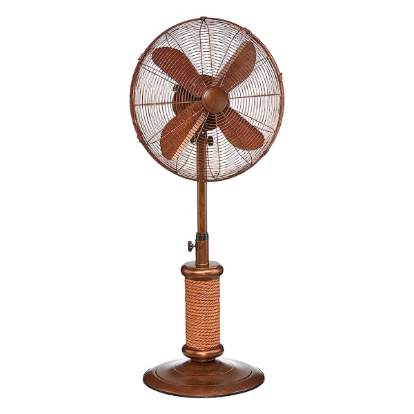 Adjustable floor fan from 36" - 51". Antique brass finish with rope base. Features:oscillating, articulating, 900-1280RPM (3 speed),