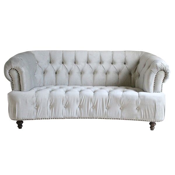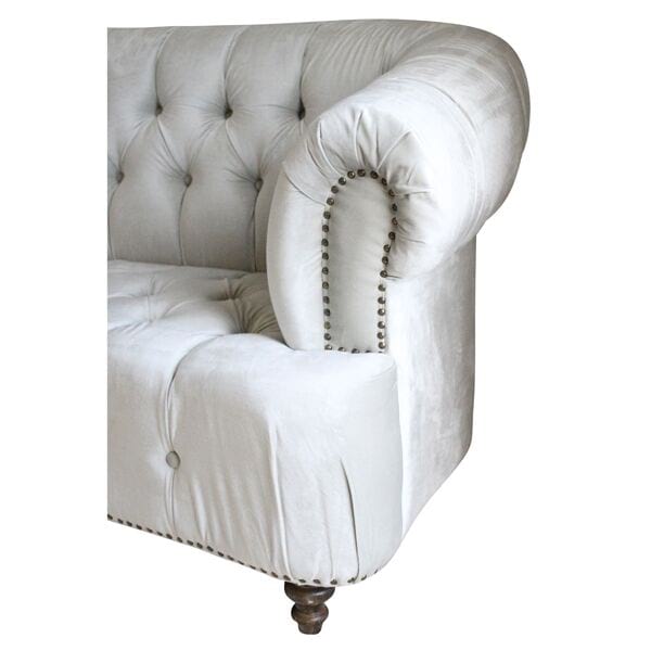 Velvet chesterfield sofa with brass nail head trim and rolled tufted arms. Gray colored velvet.