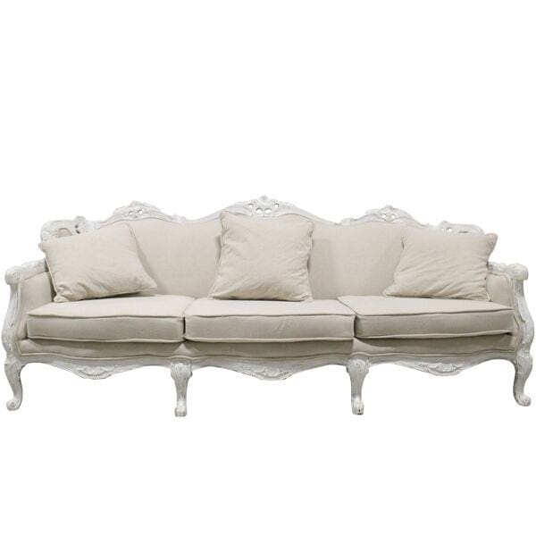 French country style sofa with white distressed carved frame, and beige linen upholstery.