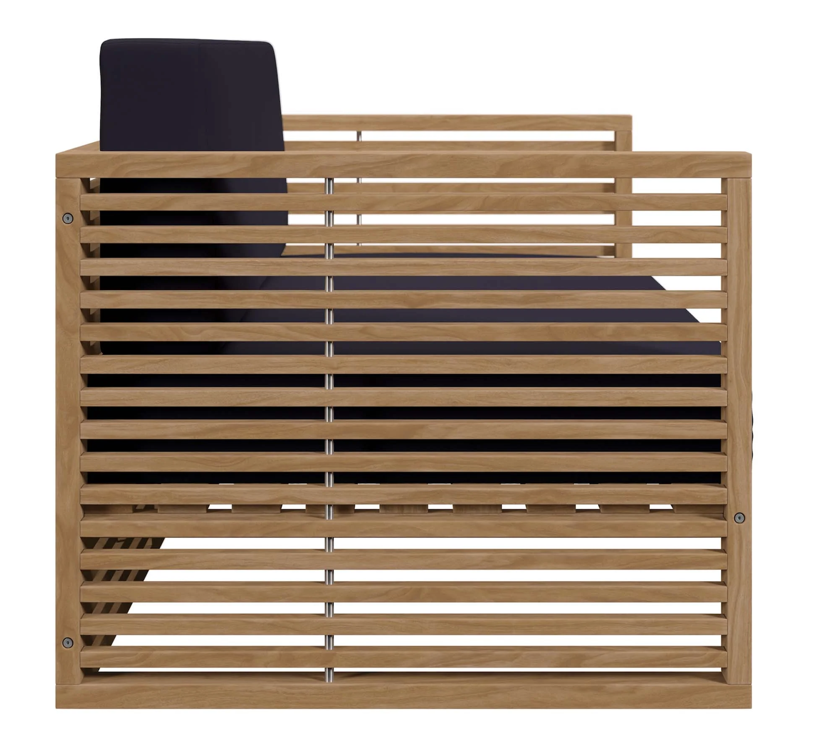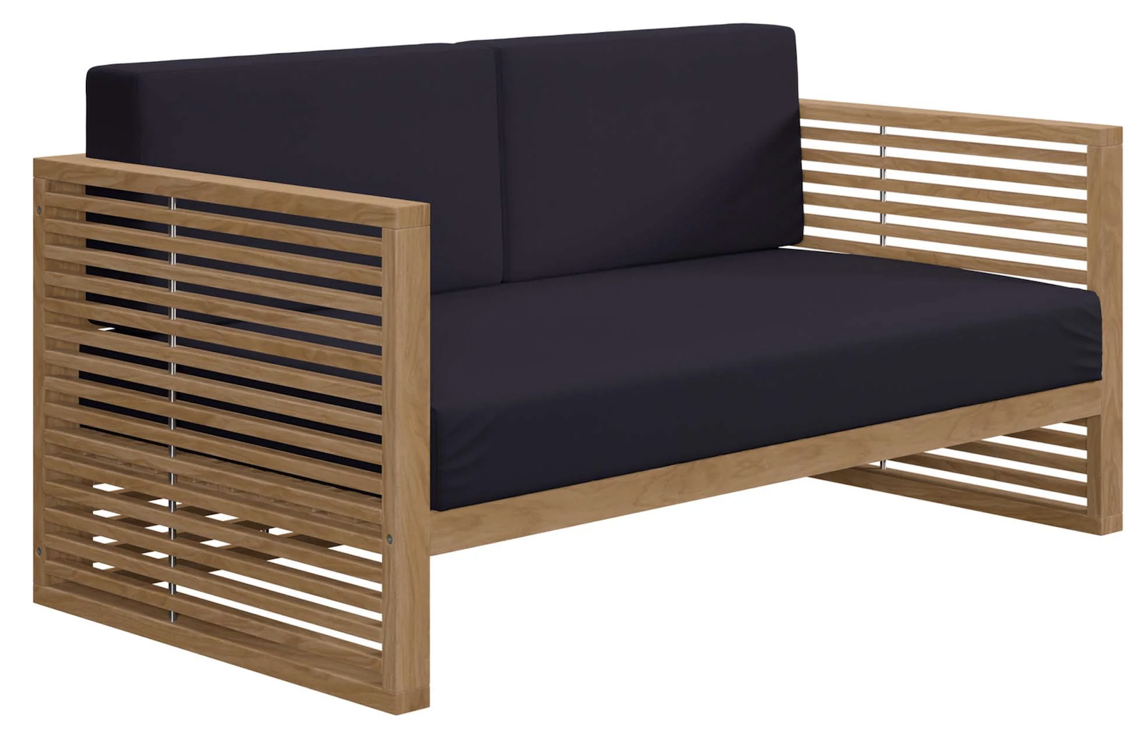 Contemporary teak wood sofa with navy sunbrella fabric,
