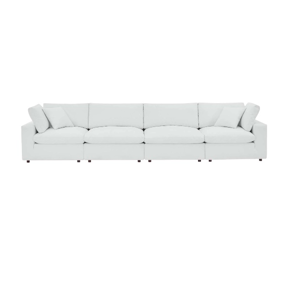Bright white vegan leather 4 piece modular sofa. This is a down sofa for extra comfort. Part of the Aspen family. Seat height 20".