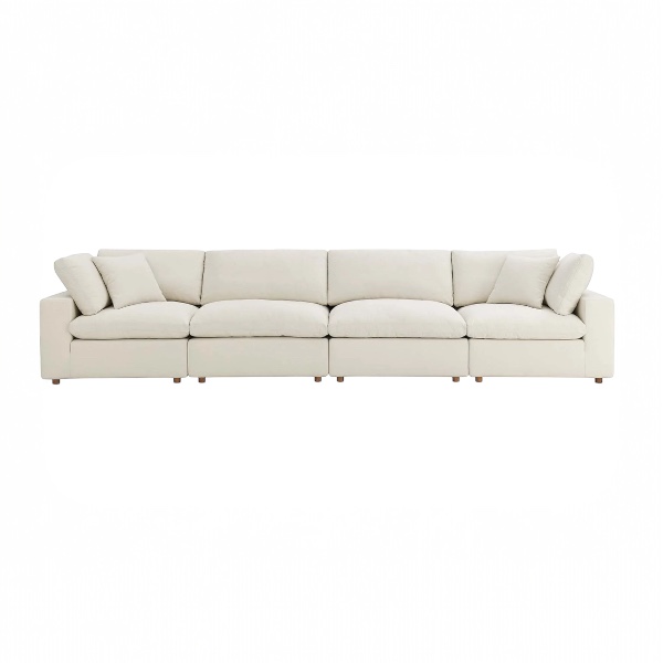 Beige linen modular 4-piece sofa; overstuffed down cushions.