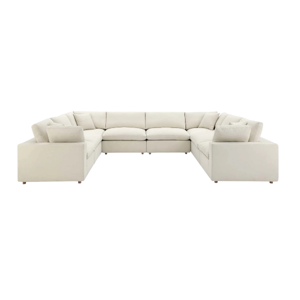 Beige linen modular 8-piece sofa to create a u-shape; overstuffed down cushions.