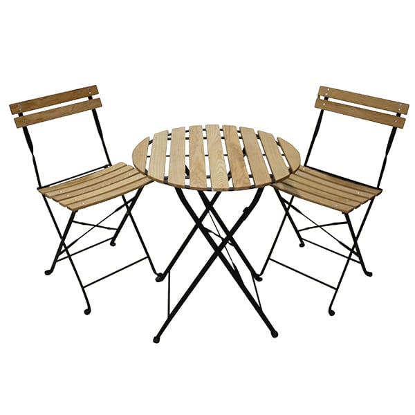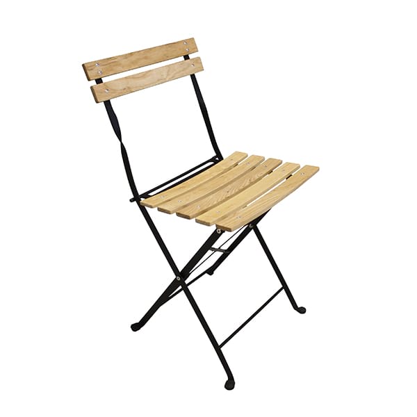 French bistro chairs with black iron frames and natural wood color slats. Coordinates with bistro table.