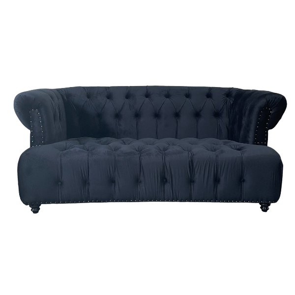 Black, velvet, tufted sofa. Coordinates with the black Trouvaille club chairs. Also coordinates with the Trouvaille C collection.