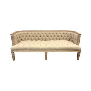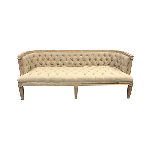Natural linen tufted sofa with ornate cirular detail on back. Coordinates well with Brady Circle Back Chairs.