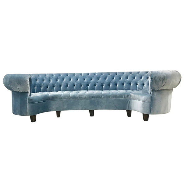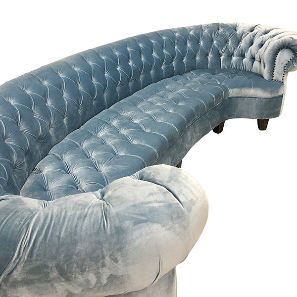 Stunning 10 ft arch chesterfield sofa with tufted seat and back and rolled arm in a light blue velvet.