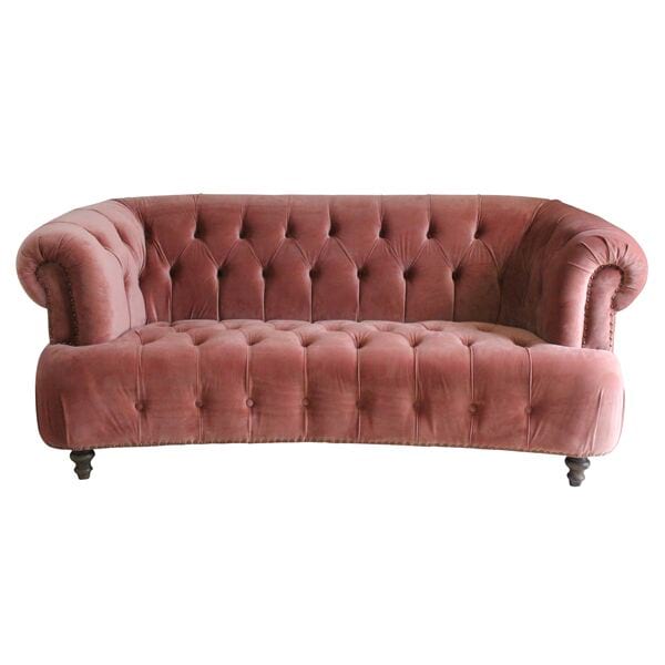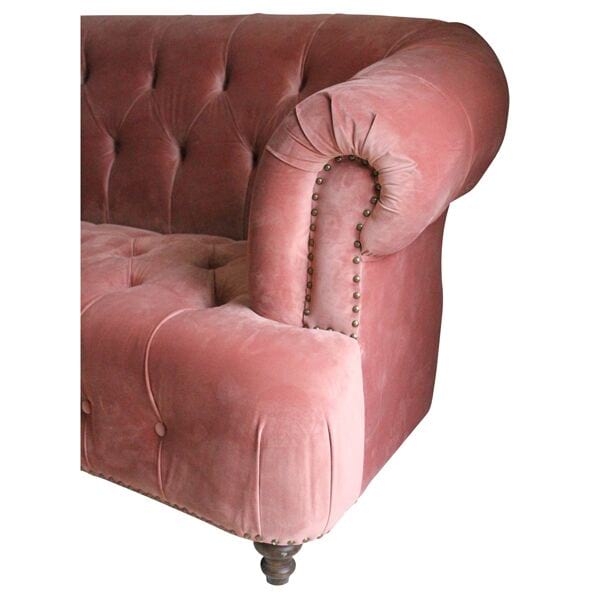 Chesterfield sofa in dusty rose velvet upholstery with brass nail head trim and rolled tufted arms.