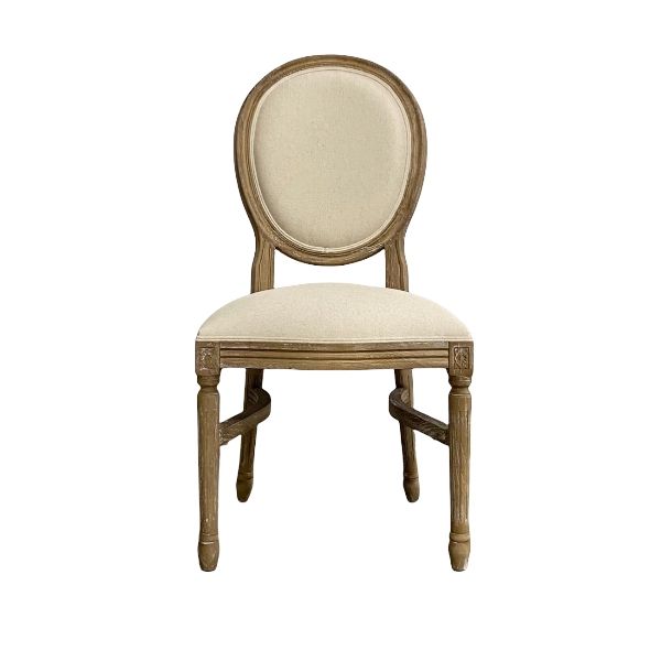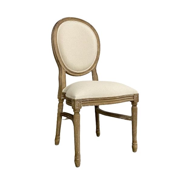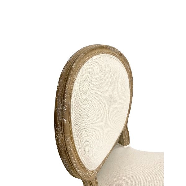 Oval back dining chair (stackable) with honeywashed wood frame and natural linen back and seat. Corridinates with Louis Cane Backs, Summit Chairs, Stackable Cane Back Chairs and any product listed to have Honeywashed finished.