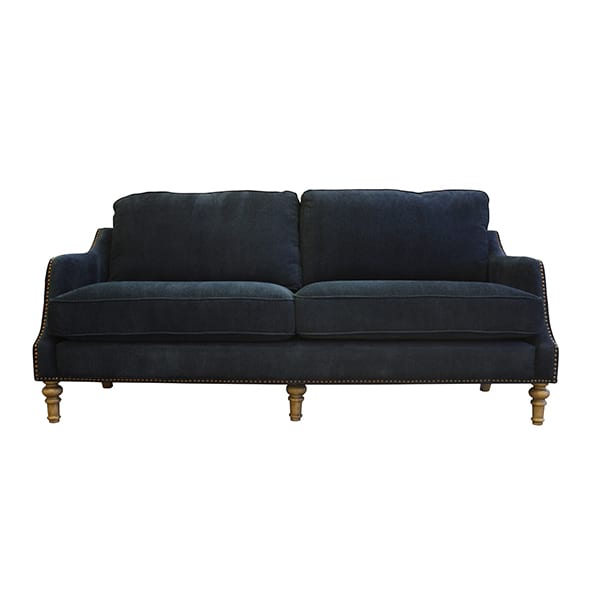 Navy sofa with nailhead trim, feathered seating and antique weathered gray wood legs.