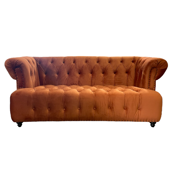 Copper, velvet, tufted sofa. Coordinates with the Copper Trouvaille Club Chairs and the rest of the Trouvaille Collection.