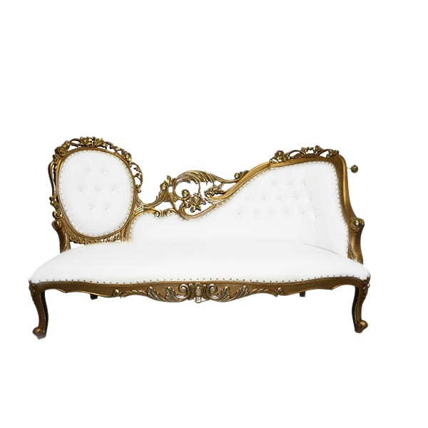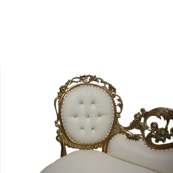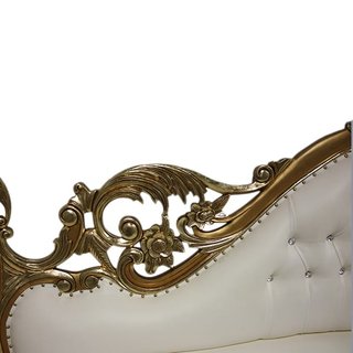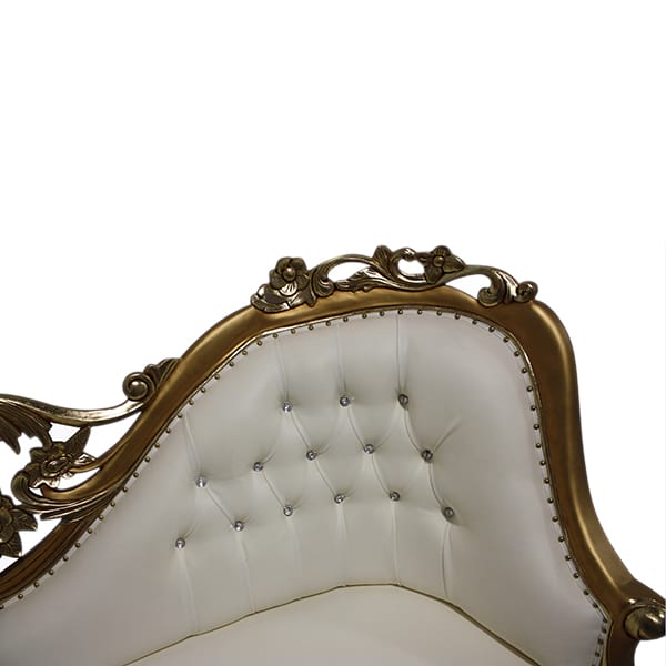 Baroque style gilded love seat with white leather upholstery and rhinestone tufting. Seat height 17".