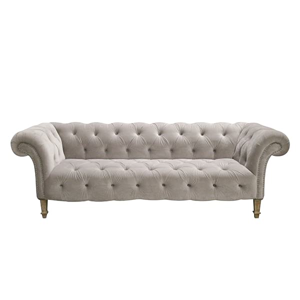 Chesterfield style sofa with rolled arms in a muted lavender/gray velvet upholstery.