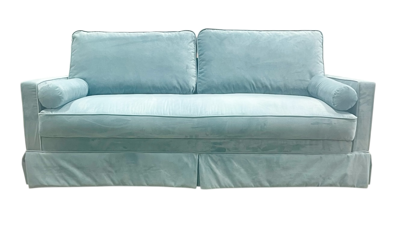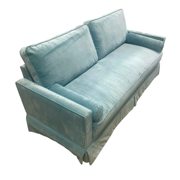 Dusky blue velvet skirted sofa.