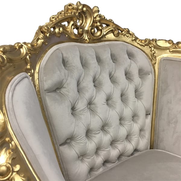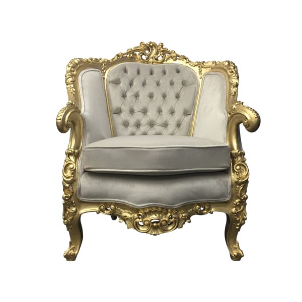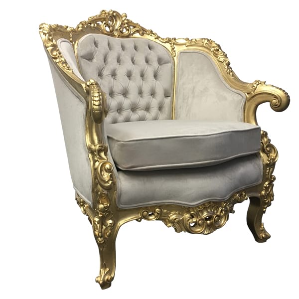 Vintage gold ornate arm chair with dove gray velour fabric; tufted back. Coordinates with the Dover Sofa.