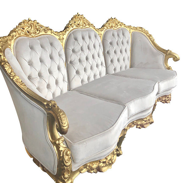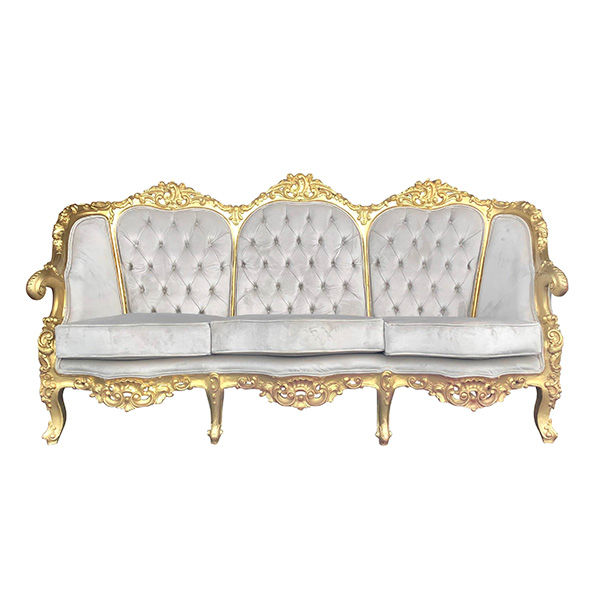 Beautifully restored gold frame sofa with a soft gray velour fabric. Coordinates with the Dover chairs. Seat Height: 19"