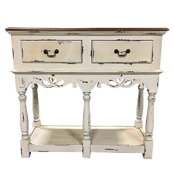 Delicate buffet table in a distressed white finish and dark wood table.