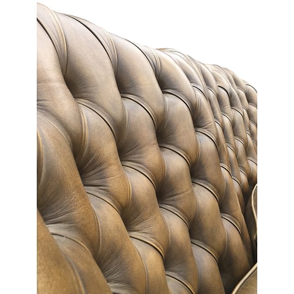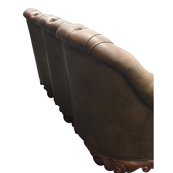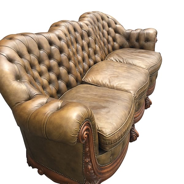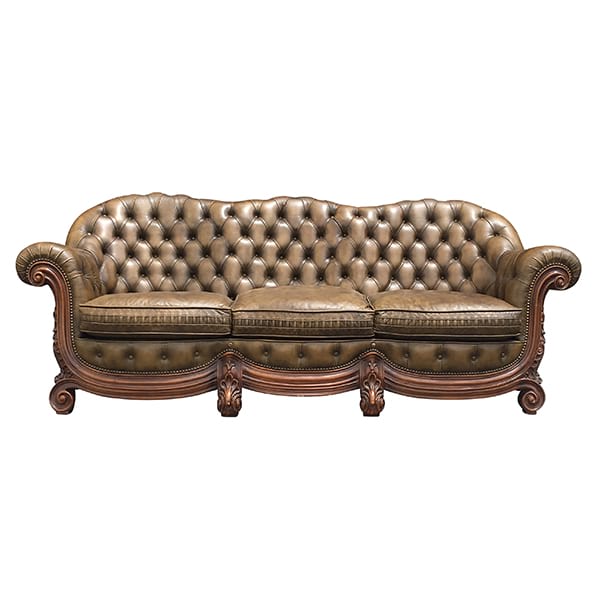 Vintage tufted brown leather chesterfield with unique curved back, rolled arms and wood trim.