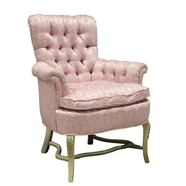 Tufted slipper chair with pink brocade upholstery.