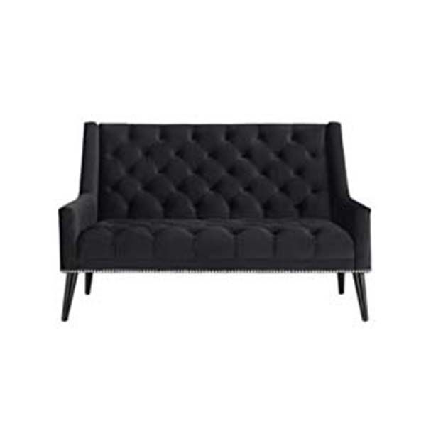 Modern, black velour, tuffeted settee. Features bright silver thumbtacks and black pencil legs.