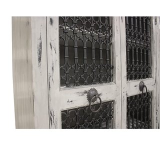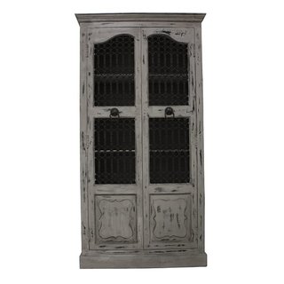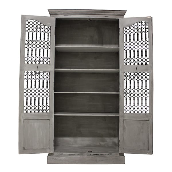Gray distressed wood finish with very ornate black metal doors and handles. 5 interior shelves, perfect for display case or bar back.