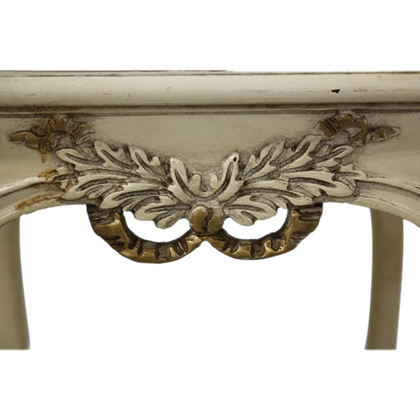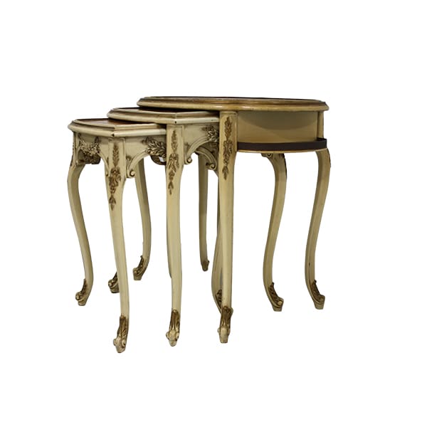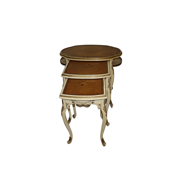 French Country nesting tables with burl-wood top, hand painted floral design and ornate carved legs.