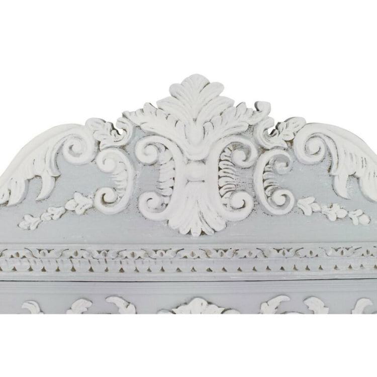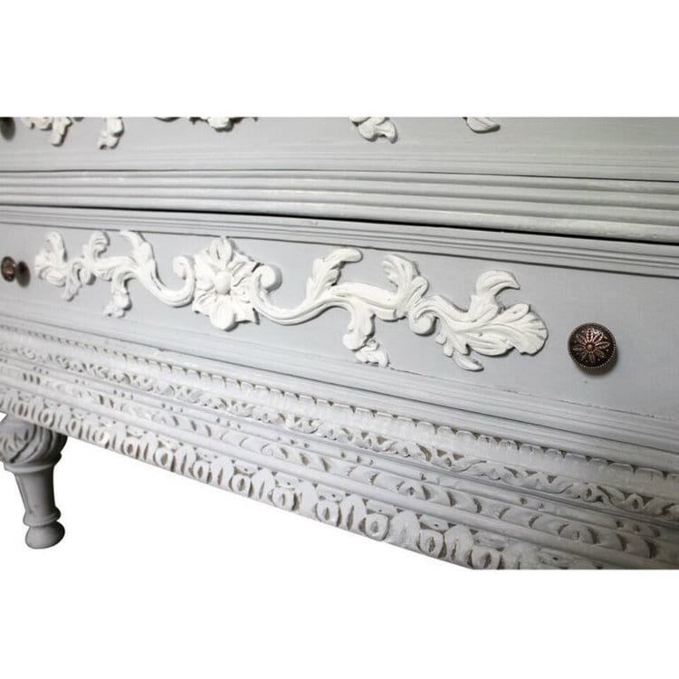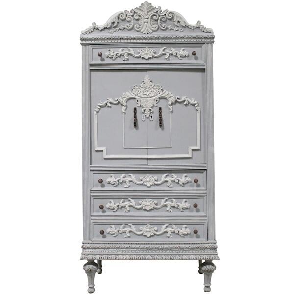 French armoire refinished in gray and white. Beautiful ornate carved details throughout, accented with bronze finished hardware.