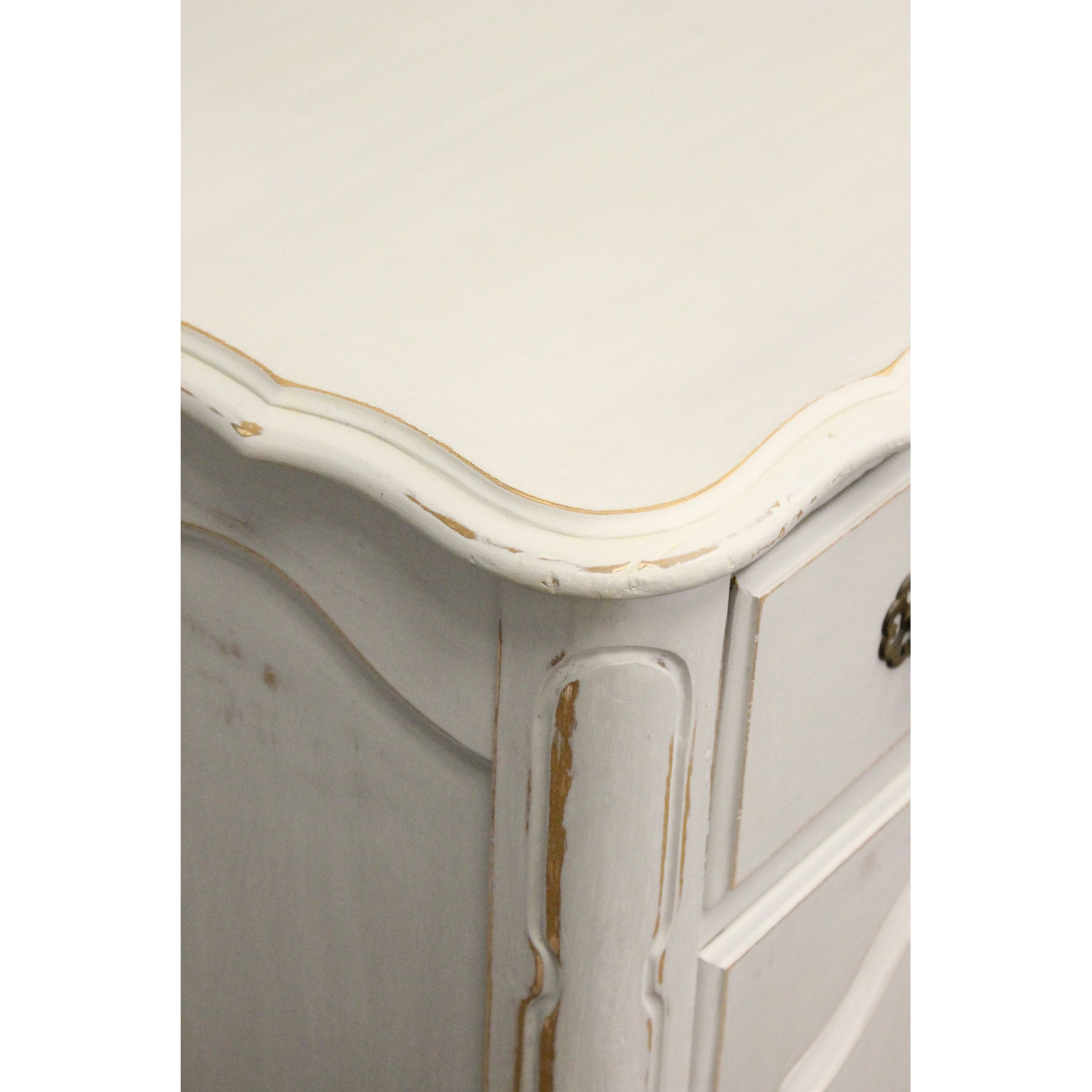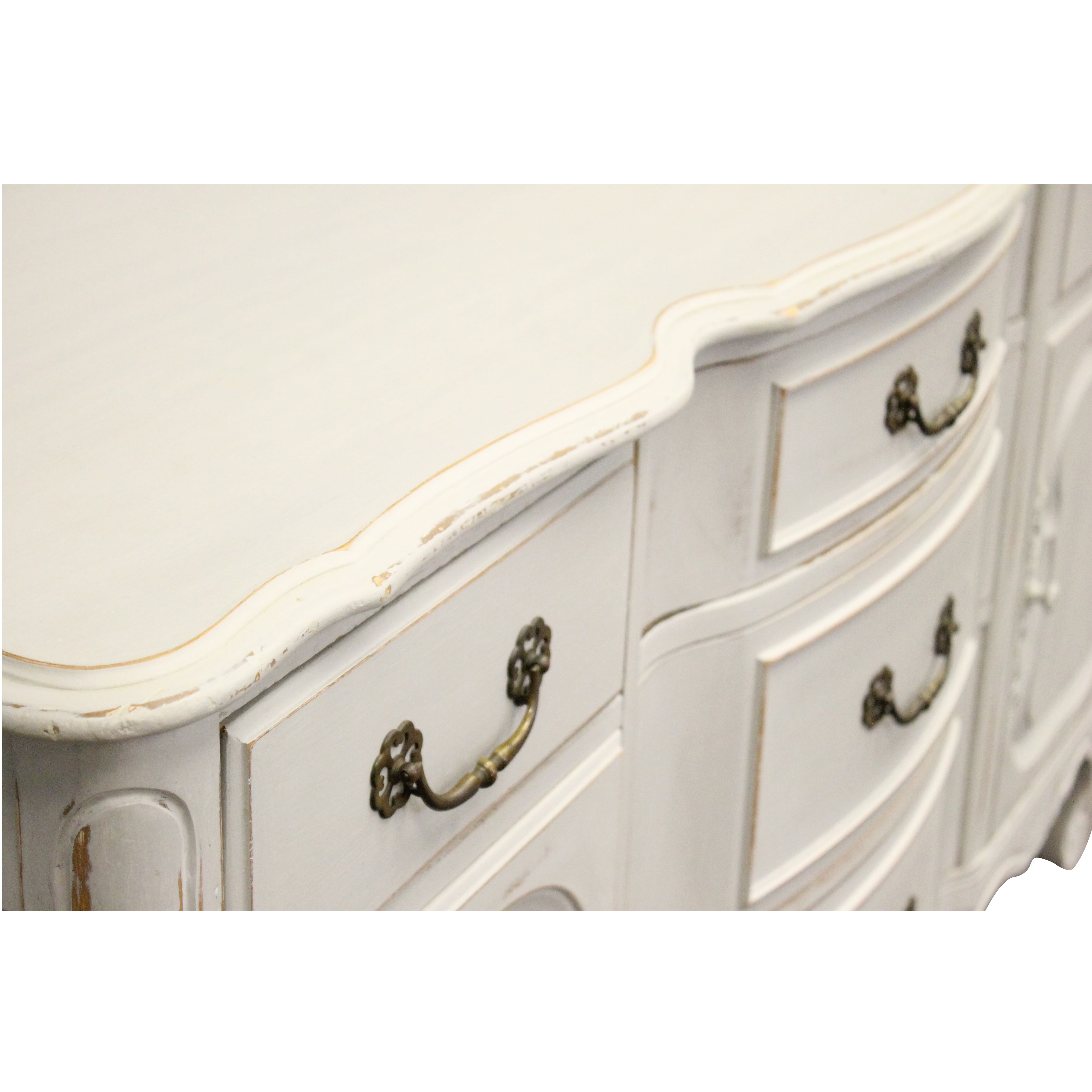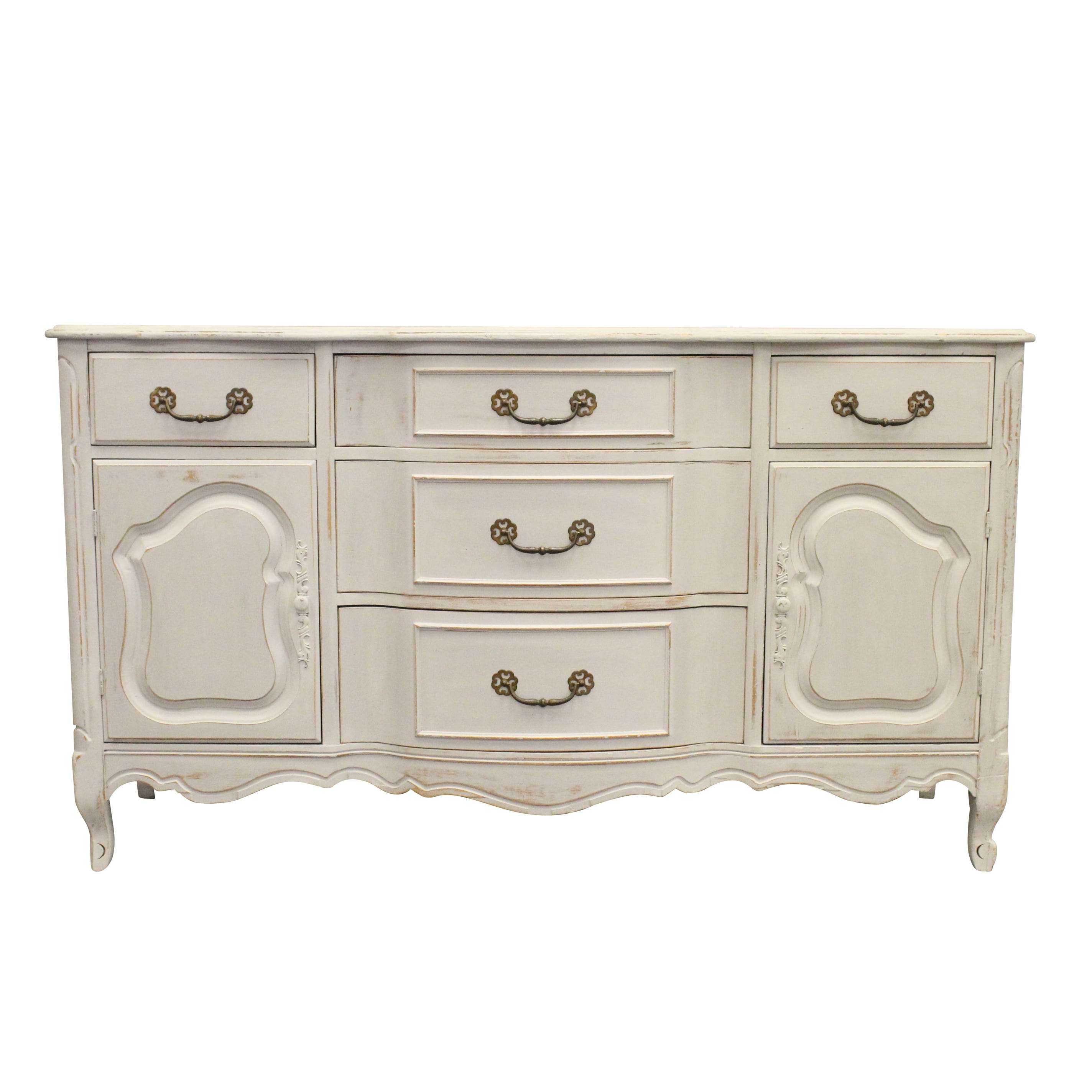 French grey provincial buffet with a distressed finish and accented with bronze finished hardware.