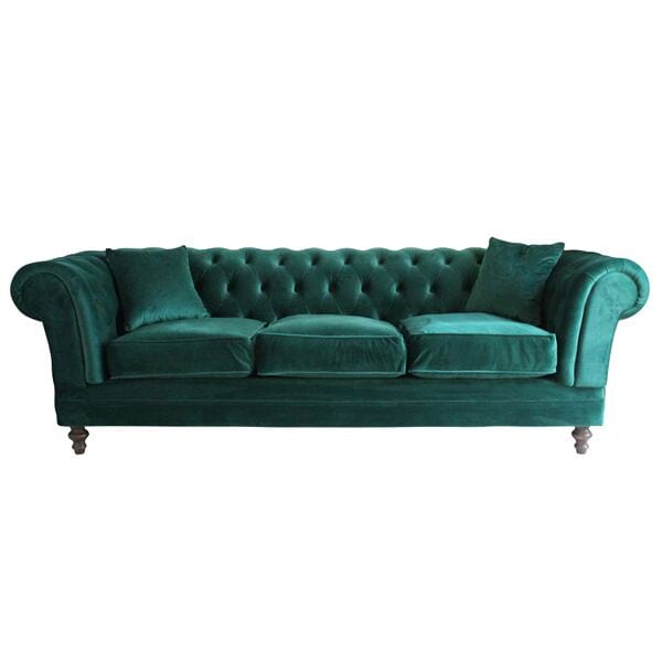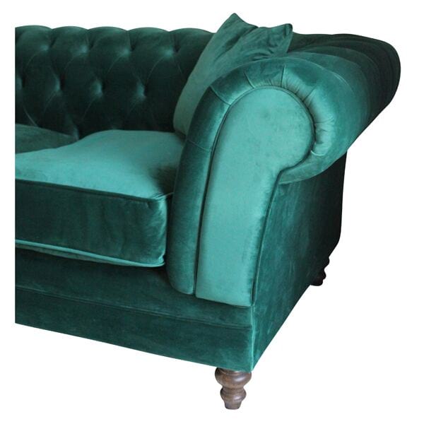 Emerald green velvet chesterfield sofa with tufted back, rolled arms and nail head trim.