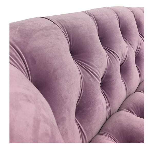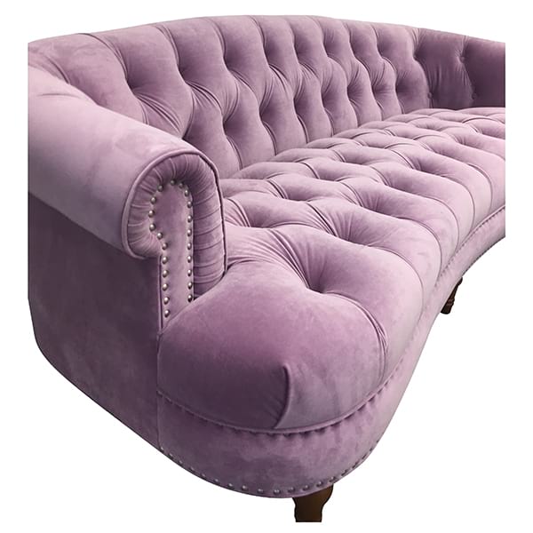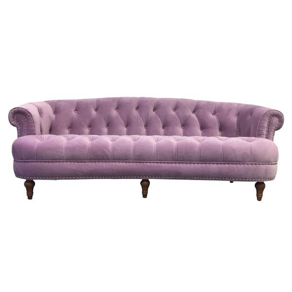 Chesterfield with rolled arms, tufted back and seat in a lavender velour fabric. Coordinates with the Kara chairs. Seat height 19".