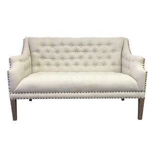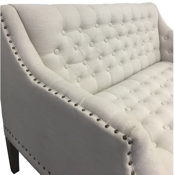 Natural linen settee, tufted back and side arms, and bronze nail heads. Part of the Kelly Collection and coordinates with the Kelly Club Chairs.