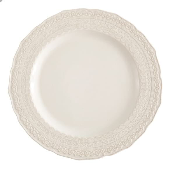 Delicated lace trim charger in a creme. Also compliments with the Finneza line.