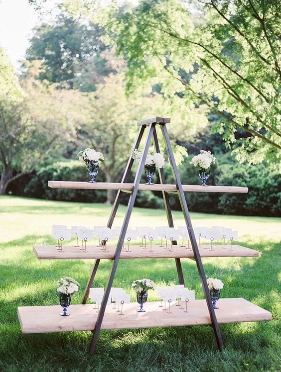 Three tiered ladder rack with wood shelves.