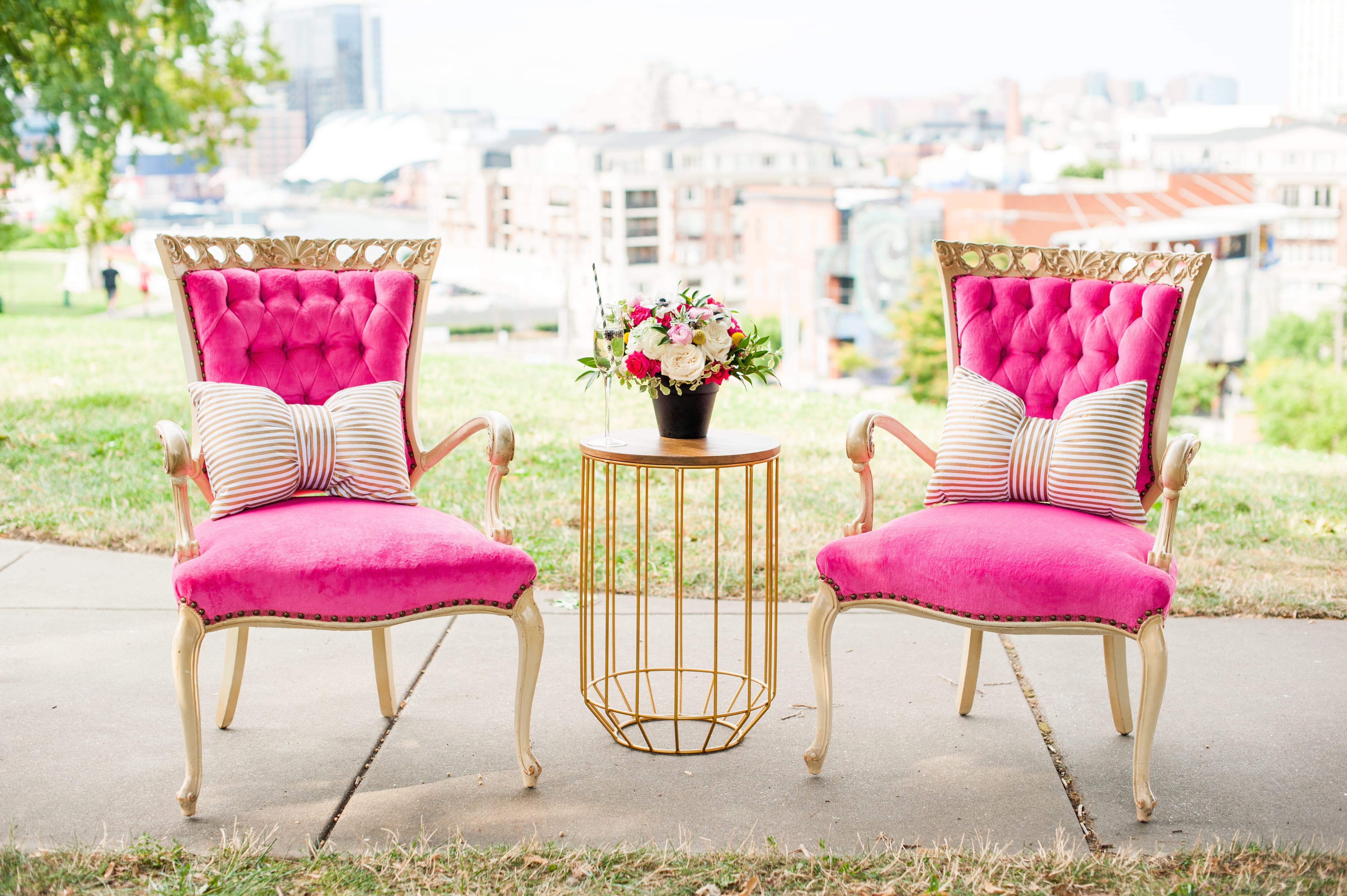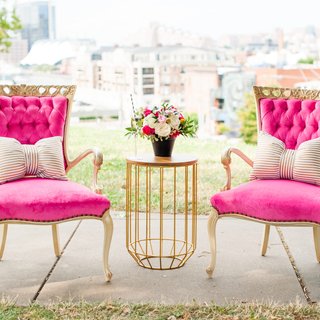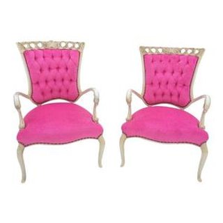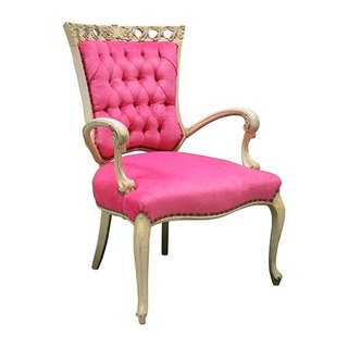 Hot pink tufted arm chairs with cream frames.