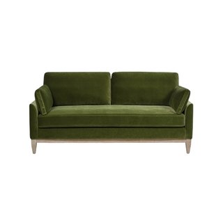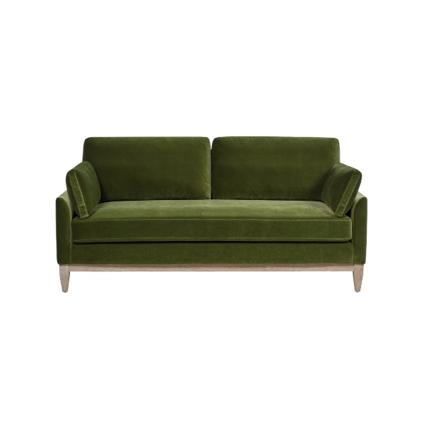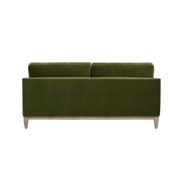 Olive green velvet sofa with honey washed leg.