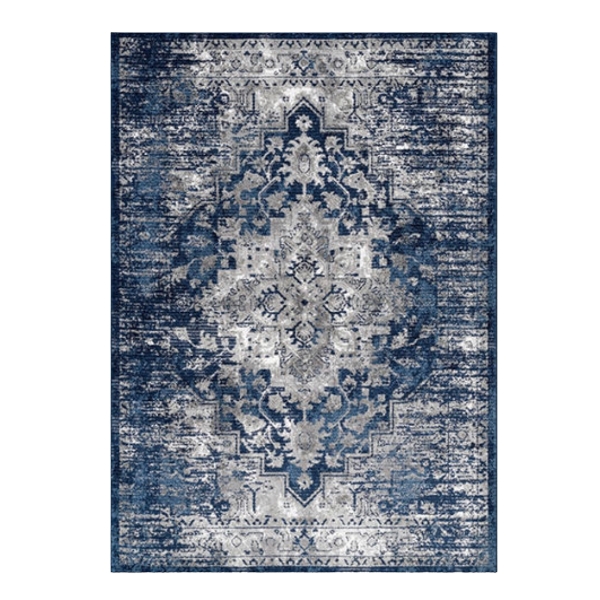 Navy rug with antique detail throughout medallion pattern.