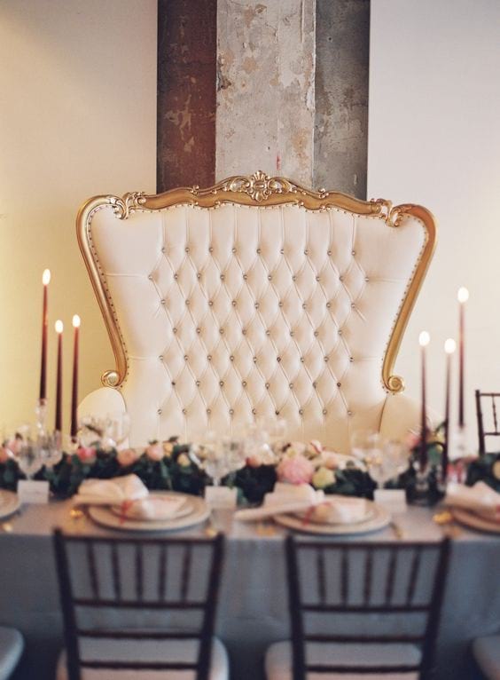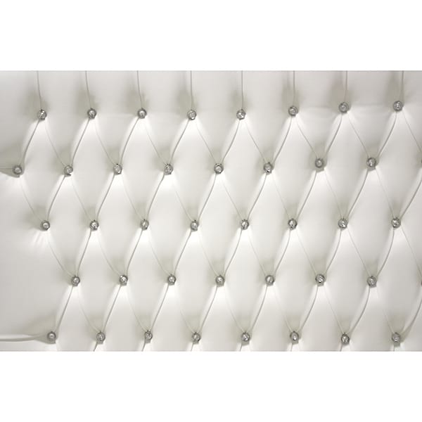 Baroque style high back love seat with white leather upholstery, rhinestone tufting and gilded frame.