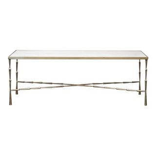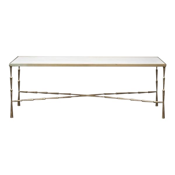 Brass spiked coffee table with honed white marble top. Coordinates with other pieces in the Santos Collection (side tables and console tables).