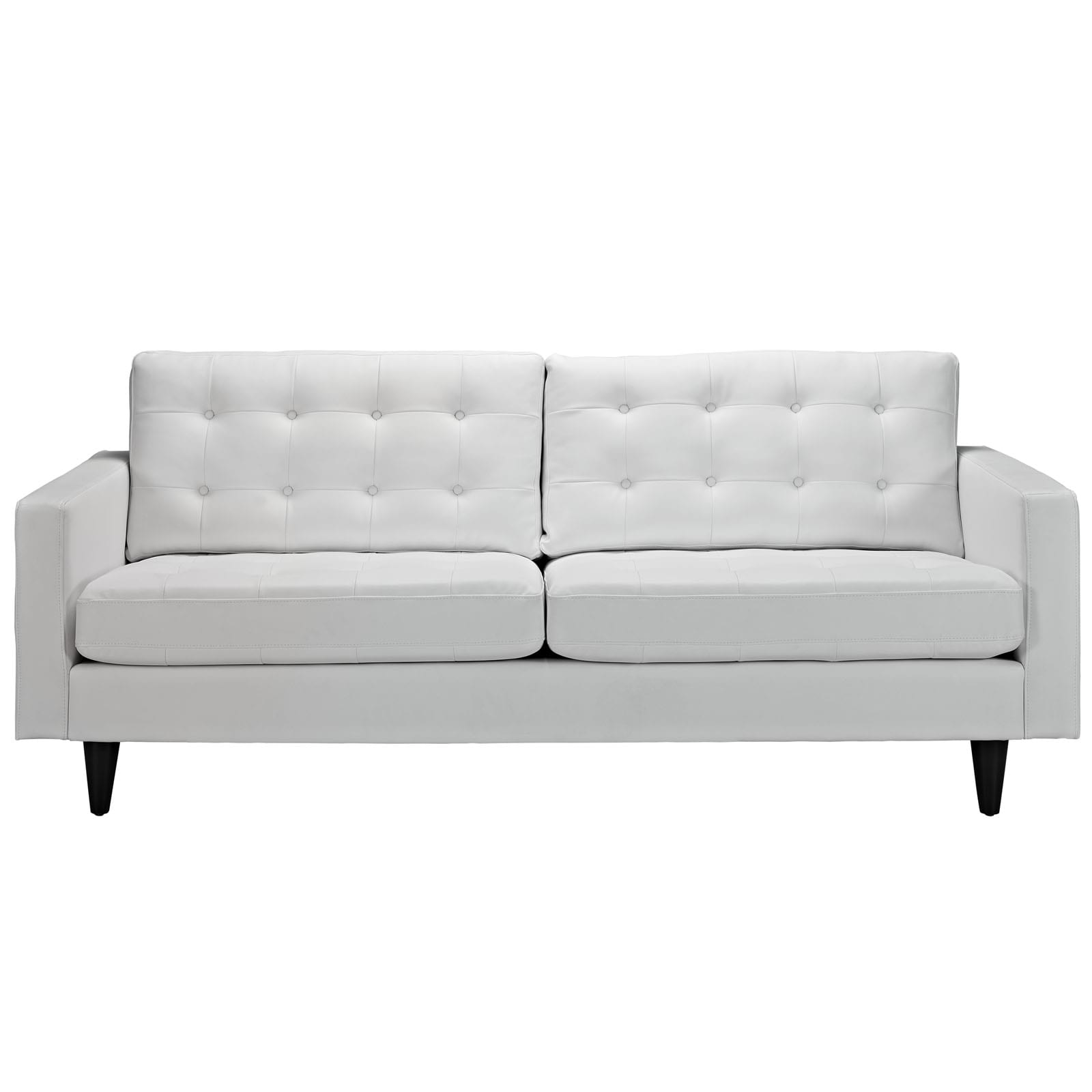 Bright white mid century/modern bonded leather sofa with tufted back and seat.