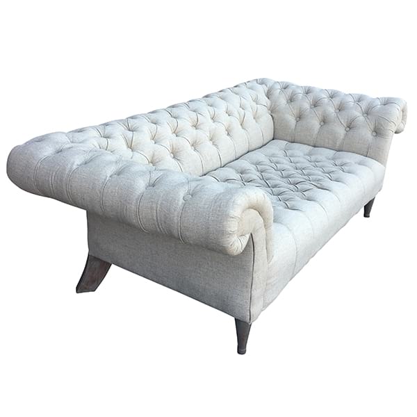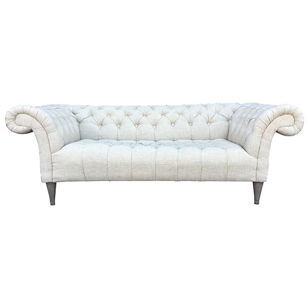 Natural linen tufted sofa with rolled arms.