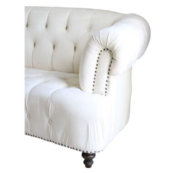 Cream velvet chesterfield sofa with brass nail head trim and rolled tufted arms.