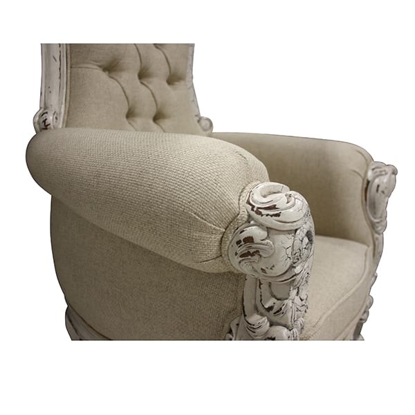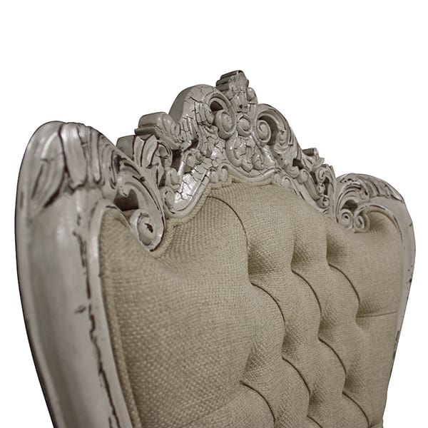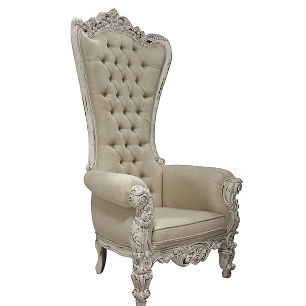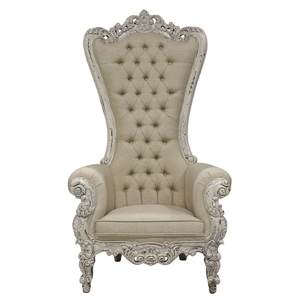 High back throne chair with neutral/ tufted linen, rolled arms and white distressed accents on frame. Seat Height 18"