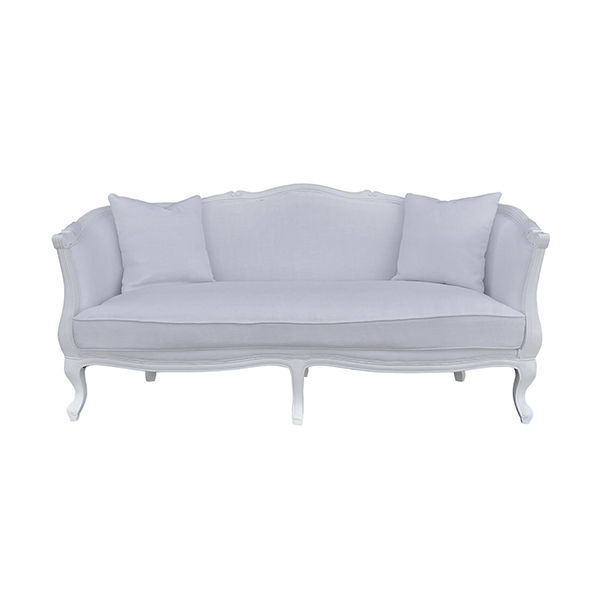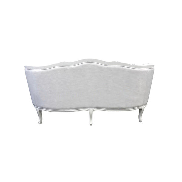 Bright white wood frame sofa with bright white linen fabric. Coordinates with Victoria chair.