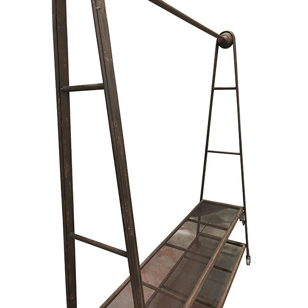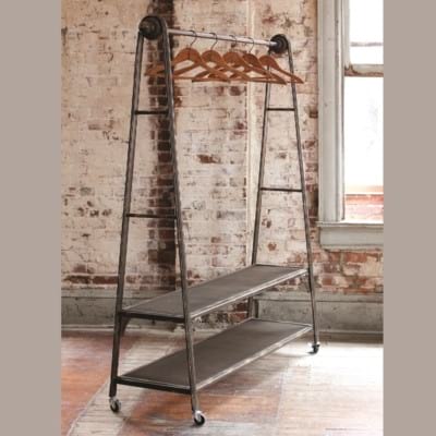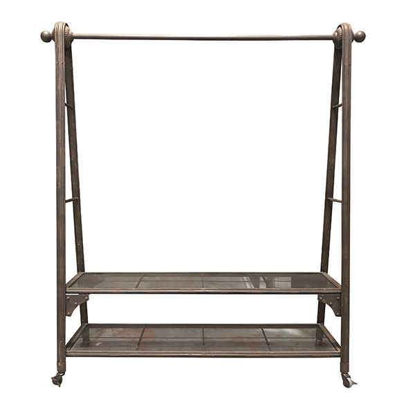 Vintage style metal clothes rack featuring two shelves and locking wheels for easy transportation.