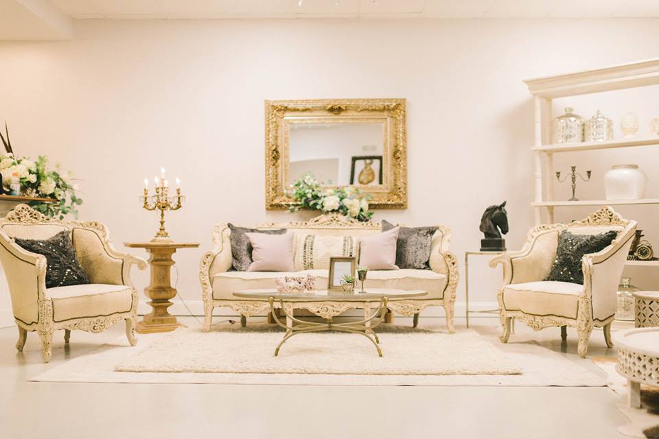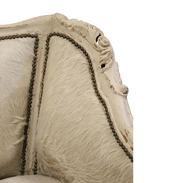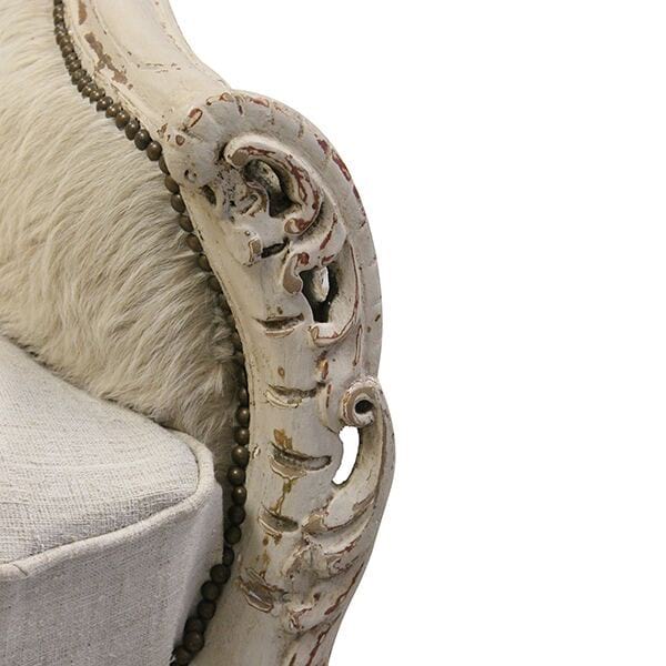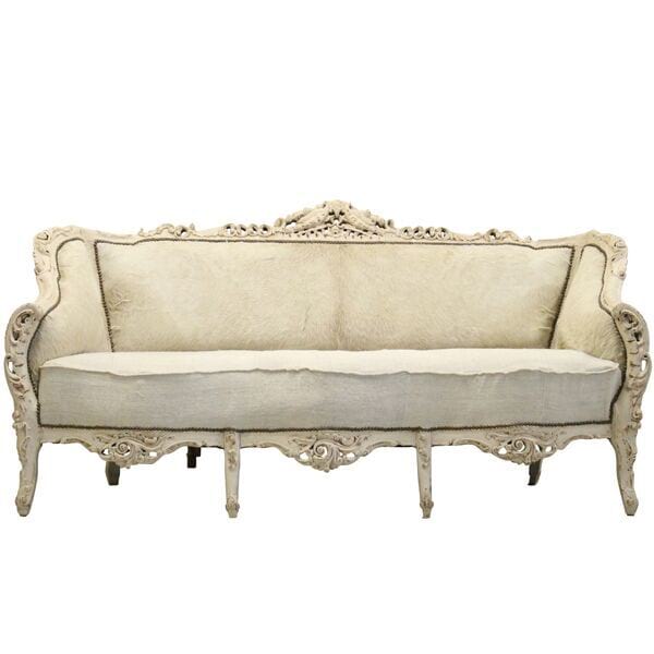 French sofa with flax linen and cowhide upholstery. Ornate Rococo style frame in cream finish.